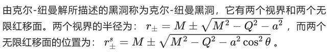 从这个公式我们可以看出,它由质量M、电荷Q和角动量J这三个参数所决定,角动量J是以单位质量角动量a=J/M来表示。当角动量为零时,它会退化成R-N解;当电荷为零时,它会退化成克尔解;当角动量和电荷为零时,它会退化成史瓦西解。