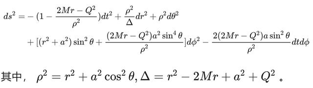克尔-纽曼黑洞在爱因斯坦发表广义相对论不久,史瓦西就得到了第一个解,我们称之为史瓦西解。但史瓦西解是比较简单的,只和质量有关。后来,又有物理学家把带电量也加入进去,得到了带电施瓦西解,或称为R-N解。1963年,克尔考虑了旋转的情况,得到了克尔解。后来,纽曼等人把克尔解推广到带电的情况,得到了克尔-纽曼解。在G=C=1的自然单位制下,我们可以把它写成如下形式:
