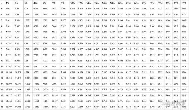 P=A×(1 i)^-1 A×(1 i)^-2 A×(1 i)^-3 ... A×(1 i)^-n 其中,P表示现值;A表示年金;i表示利率,即折现率;n表示期数。 简化计算法: 简化计算法,是在逐笔折现法的基础上,进一步简化,求出年金现值系数。 P=A×(P/A,i,n)=A×{1-(1 i)^-n}/i {1-(1 i)^-n}/i为年金现值系数,年金现值系数可以通过以上公式计算,也可以根据利率i和期数n查表《普通年金现值系数表》确认,普通年金现值系数表部分截图如下: