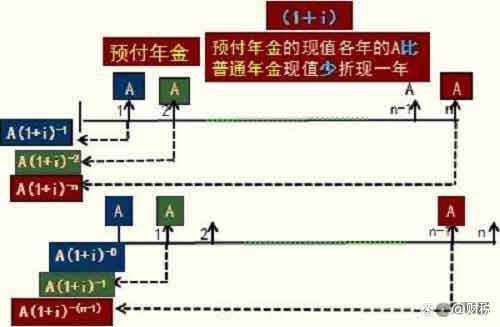 举例: 某富婆提出给你“好处费”,让你默默离开她儿子;富婆提出两个方案,哪个方案更划算,你会选择哪个方案呢? 方案一:现在一次性支付100万; 方案二,从现在开始,每年年末支付10万元,连续支付12年,假设银行存款利率为6%。 方案一现值为100万; 方案二现值P=10×((P/A,6%,12)=83.84万元。 显然,直接选择方案一,拿100万现金走更划算。 以上为普通年金现值的计算,预付年金是指在每期期初收入或支付的相同金额的一组等间距数列,预付年金与普通年金,收入或支付均发生在期初,与普通年金相比较更值钱,预付年金现值为相同条件下普通年金现值再乘以一加折现率,具体公式为: 预付年金现值P=A×(1 i)^-0 A×(1 i)^-1 A×(1 i)^-2 ... A×(1 i)^-(n-1)=A×(P/A,i,n)×(1 i) 预付年金在普通年金基础上,预付年金现值公式推导图解: