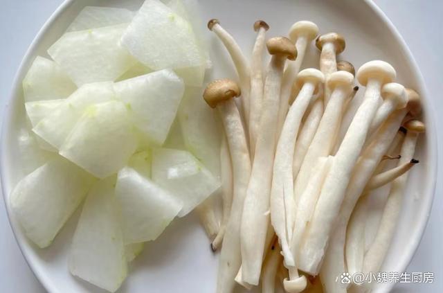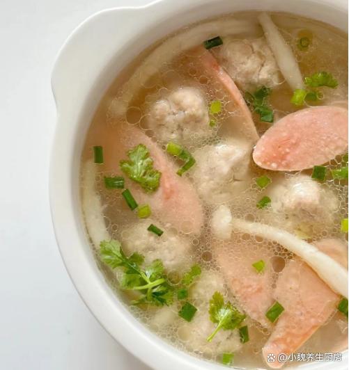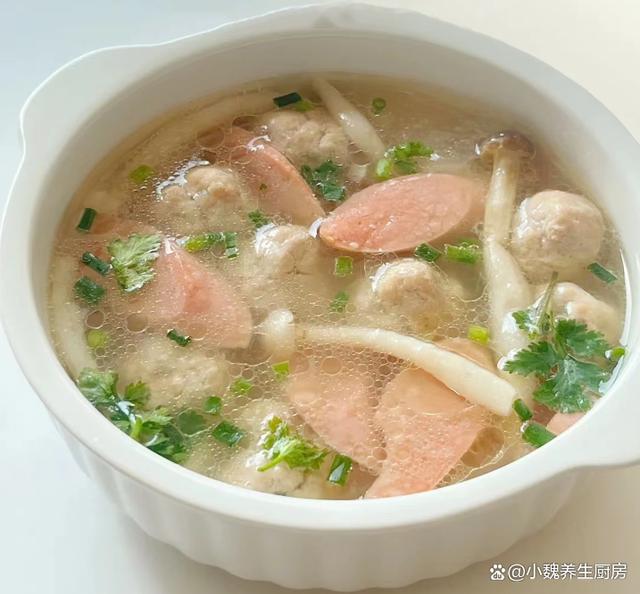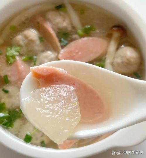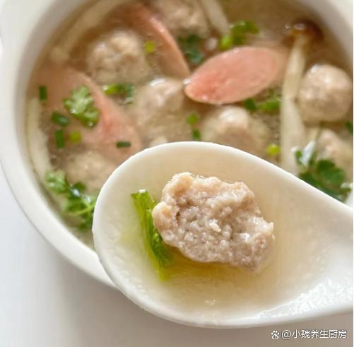 转眼就到了1月末,距离2月份更近了,新年的脚步也慢慢靠近,节日的氛围一天比一天浓郁了,冬季要结束了,春天要到来了。现在处于冬末初春的阶段,时间节点非常关键,因为天气还非常冷,身体的各项机能都很弱,想要明年春天过得顺利,需要适当给身体进补,广东人称为“冬补”,平常喜欢煲各种汤品,为身体提供大量的营养。今天分享一款鲜美好喝的汤品——冬瓜菌菇肉丸汤,肉丸子很有弹性,口感鲜嫩,汤汁也很鲜美,不懂吃可惜了。“2月一碗汤,开春不会慌”,建议平常多喝这汤,迎接新春到来。  【冬瓜菌菇肉丸汤的详细做法】 食谱解析:选购老冬瓜一大块(冬瓜是一种低脂低卡的蔬菜,才几毛钱一斤,冬瓜吃起来清爽甘甜,除了用来红烧以外,还可以拿来炖汤喝),选购白玉菇和蟹味菇各50克(菌菇是南方人用来煮汤的食材,吃起来特别鲜美,口感非常细腻,菌菇汤非常鲜美,营养又好喝),选购400克新鲜猪肉里脊(里脊肉是猪肉最鲜嫩的部位,许多人称为梅条肉,肉质特别鲜嫩,是制作肉丸子的食材首选),优质火腿肠一根,新鲜小葱若干根,食盐少许,半勺白胡椒粉和鸡精,一个鸡蛋清,半根大葱,生抽少许,辅食油几滴,淀粉少许,冷水和开水少许,其他佐料。 具体制作顺序: 1:提前准备好菌菇,冬瓜,火腿肠和猪肉里脊等食材,把冬瓜从中间切开,去掉一层瓜皮和瓜瓤,反复清洗干净,切成厚度相同的片状,放在容器备用。2:先把两种菌菇切掉根部,用流水冲洗干净,去掉异味,锅中煮一些清水,煮沸后倒入菌菇,把菌菇焯烫处理,沥干表面的水分。 3:生姜切成细丝或细末,大葱去皮切成小段,猪肉里脊去掉多余部位,切成若干小块,然后用刀剁碎成猪肉泥,放在碗中备用。 4:猪肉馅加上葱姜水,加上少许食盐和鸡精,加上一勺生抽,调入淀粉一勺,加上一个蛋清,加上辅食油少许,沿着顺时针方向搅拌,让猪肉馅充分上劲,静置半刻钟。 5:将猪肉馅搓成肉丸子,记得一定不要沾水,放在一个器皿里或案板上,锅底调入少许食用油烧热,放入葱段和姜末,快速煸炒出香味。 6:倒入两种菌菇和冬瓜,快速将其炒至变软,加上一大碗开水,放入切好的火腿肠片,盖上锅盖大火煮沸,让汤汁煮至变色。