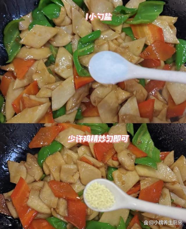 第六步:另外起锅,锅底加上少许植物油,等待油温烧热乎,加上蒜片和姜末炒香,加上一勺生抽和一勺蚝油,倒入一些青椒炒至断生。 第七步:放入一些猪油渣,放入一些胡萝卜和杏鲍菇片,将其炒至断生,加上少许白糖和食盐,加上一小勺鸡精,用锅铲迅速翻炒片刻。 第八步:关火装盘,这道青椒胡萝卜炒杏鲍菇就可以开吃了,吃起来特别下饭,孩子超爱吃,再也不挑食。 青椒胡萝卜炒杏鲍菇是一道非常开胃的菜肴,主要选用胡萝卜,杏鲍菇和青椒搭配而成,菜色很好看,简单易学,吃起来很清爽,营养丰富,胜过吃大鱼大肉。 (www.Ws46.com) 网友们,你们是否吃过这道青椒胡萝卜炒杏鲍菇呢?(文字的配图全部出自网络)
