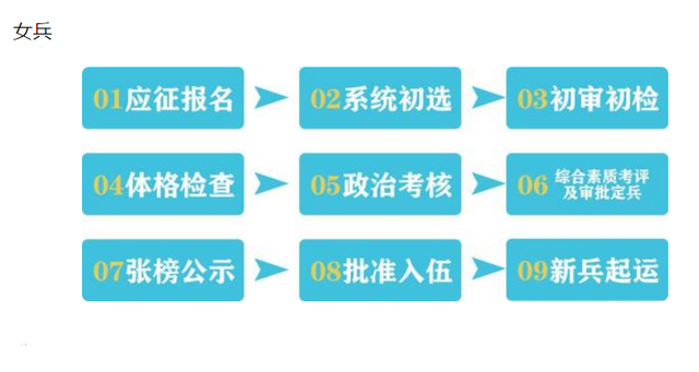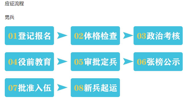三、2022年下半年征兵报名流程及入伍时间: 1.2022年下半年报名流程: 1>.网上报名:登录全国招聘网申请报名。 2>.打印表格:信息填写完整后,由高校毕业生和在校生打印《大学生报名登记表》,其他青年打印或下载《男性公民兵役登记/报名表》,交其常住户口所在地镇(街道)武装部。已打印并在兵役登记中提交的不再打印。 3>.初审流程:根据兵役机关的通知和安排,参加体检和政审。 4>.流程:接收预征用对象通知:在通过初审的青年中,选出预征用对象,发放预征用对象通知。高校毕业生和入学前选择回常住户口所在地的学生提出申请,到学校武装部领取《大学生预征对象登记表》和《应征入伍大学生补偿学费申请表》补偿国家助学贷款。征兵体格检查开始前,应当到入伍前常住户口所在地的县级兵役机关提出申请。 5>.体检和政治考核:下半年8月中旬开始,按照应征入伍地兵役机关的安排,按时参加征兵体检和政治考核,符合条件者择优批准入伍。 6>.预定新兵:省级或地市级征兵办公室将按照综合素质测评成绩从高到低的顺序,确定所有符合条件的青年新兵为预定新兵,并在省、地、县三级征兵办公室公示至少5天。 7>.批准入伍:经公示无问题的,确定为批准入伍对象。 2.2022年下半年报名时间: 2022年下半年的征兵时间一般在9月上旬左右,新兵一般需要在9月10日左右到达部队。 |