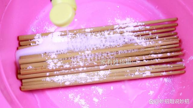 之后,我们再拿块百洁布,用百洁布将筷子一根根的清洗一下。很多朋友洗筷子,就是一把一起洗的,这样就会出现筷子的某一些面没有清洗到的情况,而一根根的清洗,就能将筷子每个面都清洗到,也就能洗得更加干净了。