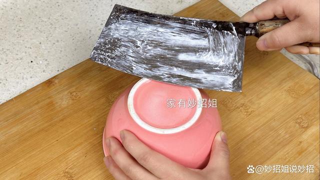 将牙膏均匀的涂抹在刀面之后,我们再准备一个平时吃饭用的陶瓷碗,把陶瓷碗倒扣在桌面。在碗的底部通常都是有凸起的碗沿,这样就会在中间形成一个凹进去的小碗状态。接下来,我们往碗底的中心部分倒上一勺食盐和一点白醋。食盐的颗粒非常细小,它可以起到一个增加摩擦力的作用,而且食盐还可以活化钢铁。白醋的话,它具有软化的功效,能使菜刀更好打磨。