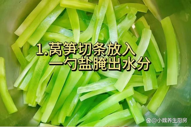 进入到新年的一月份,我们还在回忆过去,今年已经快要度过一个月了,今年是龙年,是一个平安吉祥的年份,希望大家都能够工作顺利,家庭和睦,幸福安康。到了一月份,公司一直忙于年会的事情,最近非常忙碌,白天在公司吃快餐,晚上一家人都在家,肯定不能太马虎了。冬天到了末期,上市了很多新菜,萝卜和白菜都吃腻了,不如尝尝这道家常菜肴——辣椒莴笋炒瘦肉丝,莴笋也是冬季的时令菜,色泽好看,搭配肉丝是绝配,好吃不油腻,营养合理搭配,不懂吃可惜了。冬天,萝卜白菜靠边站,最该多吃这菜,营养搭配,出锅后就光盘。  【辣椒莴笋炒瘦肉丝的食谱解析】 食材明细:选购新鲜莴笋1-2根(莴笋又叫莴苣,湖北人每家每户都种植莴笋,外形细长,叶子和根茎都能够食用,色泽非常好看,清脆爽口,食用方法很多,听说可以改善失眠,还可以疏通我们的肠道),小米辣若干个,几个青椒,选购半斤猪肉里脊(或者选择牛肉里脊,都是最嫩的部位,肉质鲜嫩,吃起来不会柴,搭配任何蔬菜都好吃),一些大蒜头,生姜一小块,适量料酒,辅食油和植物油少许,生抽和蚝油少许,红薯淀粉适量,其他佐料。 具体制作顺序:1:提前选购好莴笋,辣椒和猪肉里脊,先把小米辣洗干净,去掉蒂切成小段,生姜切成一些细丝,大蒜用力拍扁,切碎成蒜末,备用。2:先把几个青椒去掉蒂,从中间切开,去掉里面的瓤,洗净切成若干细丝,备用。3:提前把猪肉里脊反复洗净,去掉一层筋膜,先改刀切成片状,然后顺纹切成细丝,肉丝不能切太粗了。 4:剥掉莴笋的叶子,切掉莴笋的头尾,顺着外皮去皮,削掉一层白茎,切成若干长条,备用。5:莴笋条放在容器里,加上一勺食盐,用手抓拌均匀,杀出里面的水分,这样吃起来口感会好一些。