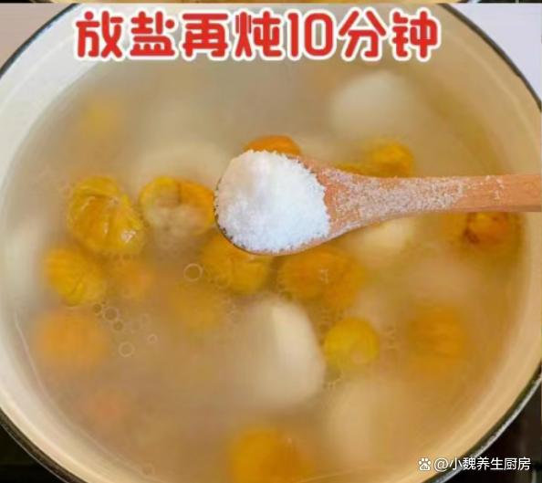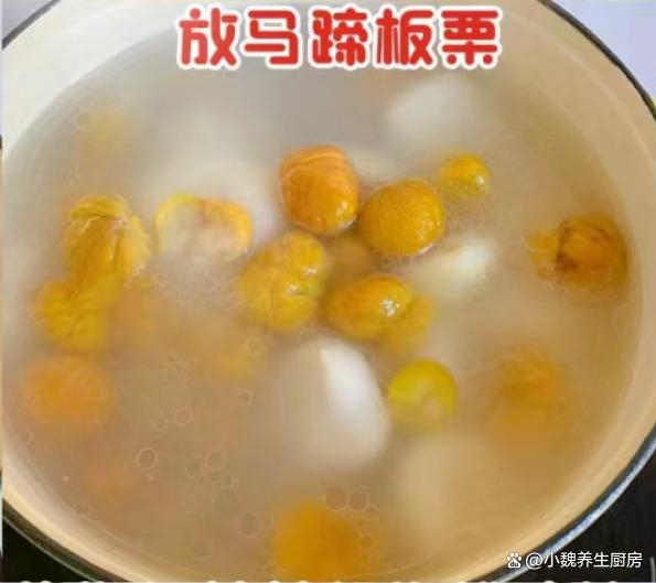 第七步:放入一些板栗和马蹄,还可以放入红枣,陈皮等食材,记得要小火炖煮40分钟,让汤汁变得更浓郁。
