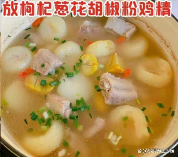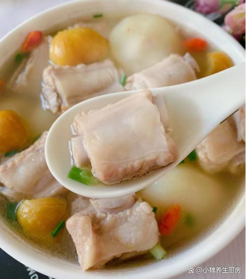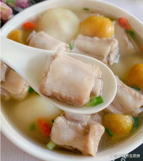 第八步:出锅之前加上食盐和胡椒粉少许,迅速用勺子搅动,放入一些枸杞子煮一会儿,丢入葱花粒即可,关火盛出。 马蹄板栗炖猪骨汤是一款清甜滋补的家常鲜汤,非常受广东人的喜欢,猪骨和这几样煲汤喝,发挥食材的营养价值,让汤品鲜美倍增,好喝不油腻,润肺去燥,好处多多。 网友们,你们是否喝过这款马蹄板栗炖猪骨汤呢?(文中的全部图片都出自网络)