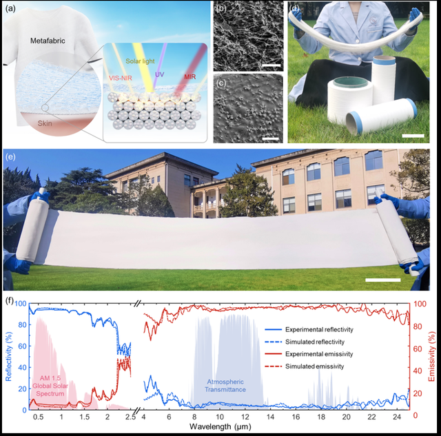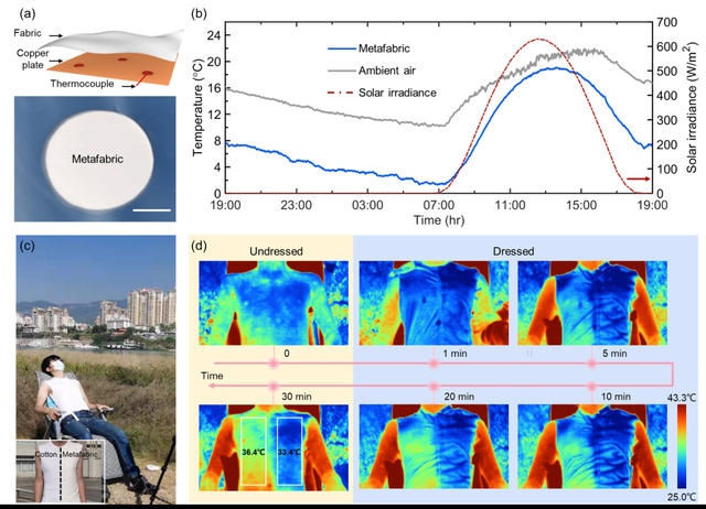 根据数据显示,这种超材料织物在太阳光波段中具有92.4%的反射率,在中红外线中具有94.5的发射率。如此之高的反射率使它反射了大部分太阳光,而高发射率则将大部分热量散发出去,低吸收高排放使得它的温度能够降低。 除了实验室进行测试之外,该光学超材料织物还在实际环境中进行了测试。在正午时间段,使用超材料织物对模拟皮肤进行覆盖,得到的结果比一般商业面料的温度还要低5-7摄氏度。另外,用新材料制成的车衣覆盖在汽车上,相较于一般车衣,车内温度相差了27摄氏度。最后,在真人测试中,志愿者穿着新材料制成的衣物,在阳光下暴晒30分钟,温度也比一般衣物要低4摄氏度。
