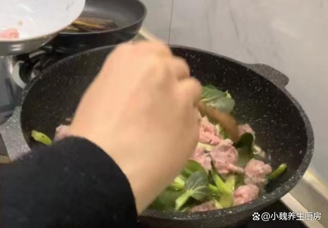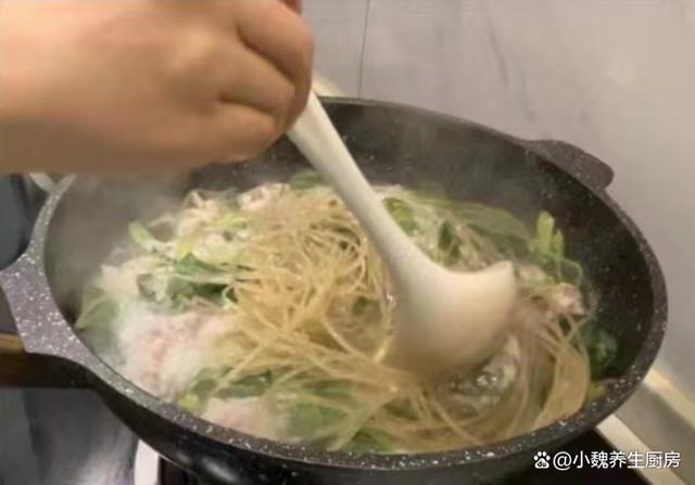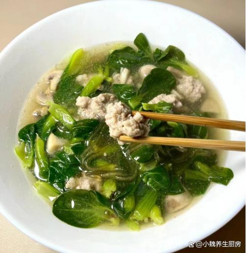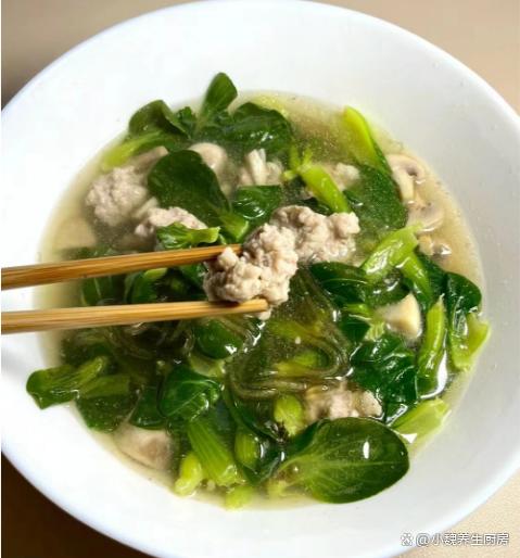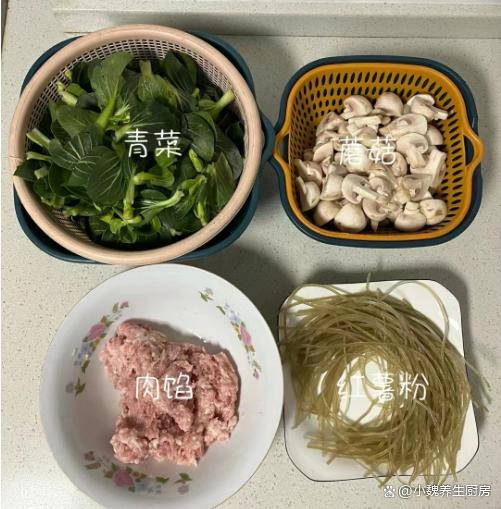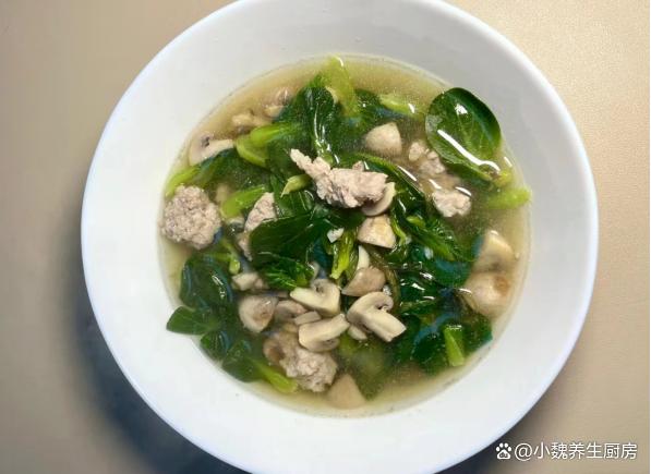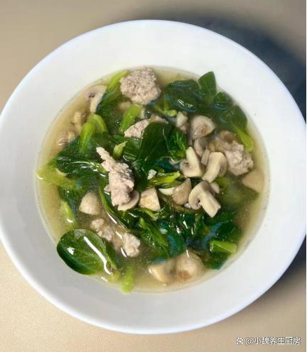 时光荏苒,刚刚结束了2023年,就迎来了新年第一个月,2024年已经度过了20多天,感觉一个月一晃眼就过完了,时间过得真的很快,距离春节越来越近,冬天也要悄悄离我们而去。目前还是寒冬时节,各地都在飘雪,气温一直在降低,阴冷潮湿的天气,会让人气色很差,手脚出现冰凉,全身都没有力气。冬季进补,很多人只知道喝鸡汤,其实还有很多食材可以用来煮汤,比如说菌菇,肉类和蔬菜等等。今天准备用口蘑,小青菜和猪肉制作一款家常汤品——青菜口蘑粉条肉丸汤,汤汁鲜美,学起来吧。寒冬到了,宁愿少喝鸡汤,也要多喝这碗汤,补足营养顺利过冬。  【青菜口蘑粉条肉丸汤的食谱解析】 食材明细:选购小青菜150克(小青菜是一种非常常见的绿色蔬菜,叶片含有大量的草酸和维生素,叶片非常鲜嫩,可以用来素炒,还可以用来煮汤),选购优质口蘑200克左右(口蘑又名白蘑菇,被称为“菌中之王”,口感非常鲜嫩,营养价值很高,适合做成各种美味菜肴),红薯粉条少许,冷水和温水少许,选购新鲜前腿肉350克,少许食用油,味极鲜半勺,鸡精和食盐少许,生姜一小块,香葱若干根,半个鸡蛋清,生粉或淀粉少许,一丢丢胡椒粉,其他调味品。 正确制作顺序: 1:提前准备口蘑,小青菜,新鲜猪肉和红薯粉条等食材,先把口蘑的根部切掉,用流水冲洗几次,或者用盐水浸泡,洗净切成若干小块,备用。2:把前腿肉去掉肥肉,彻底清洗干净,切成若干小块,用刀剁碎成猪肉末,也可以放入料理机,全部绞碎成肉馅。3:猪肉馅放在碗中,加上一些葱姜水,加上半个鸡蛋清,加上生粉一小勺,加上一小勺酱油和半勺蚝油,加上食盐少许,搅拌均匀,静置一小会儿。4:小青菜的叶子掰下来,反复用清水冲洗干净,控干表面的水分,红薯粉条用温水泡发开,太长可以切成两半。