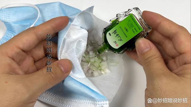 接下来,取一瓶风油精。夏天时,许多家庭都会备有风油精。我们在洋葱上滴几滴风油精。最后,用之前取出的铁丝将开口扎紧。这样,一个天然无毒的驱虫包就制作完成了。