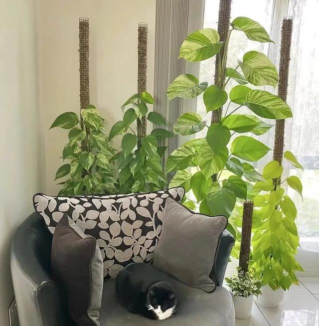绿萝的用处还很多,可以制作成电视背景墙,用专业的物件把枝条固定在墙面上,枝条就会顺着墙根爬,越长越高,越长越长,或者让枝条垂直向上生长,那就需要在花盆里立一根柱子,把枝条盘在柱子上,这么做也很新颖,更体现出独特感,叶片长的也会很大很亮,就像一棵绿萝树。