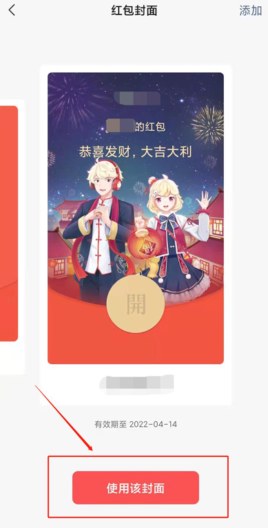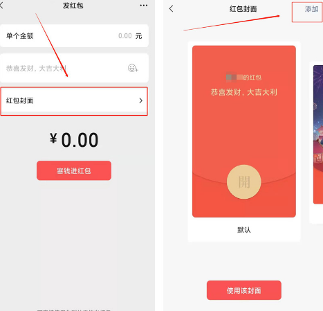 3、进到发红包界面后,点击“红包封面",点击页面上的“添加";