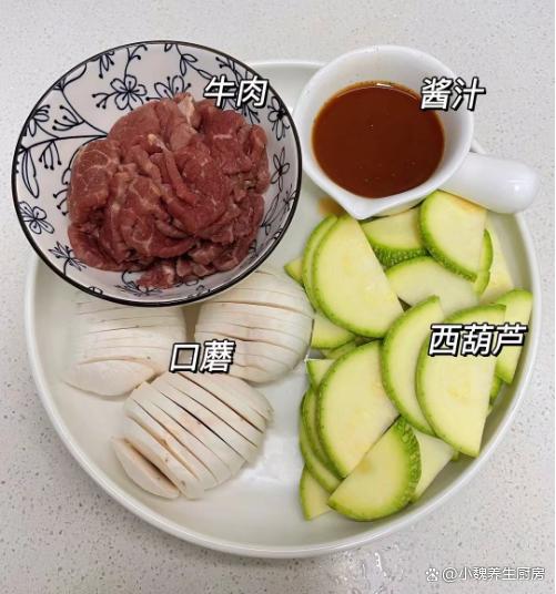 已经进入到新年,2024年一月份,是新的开始,冬天马上要过去,春天也越来越近,现在还处于寒冬时节,天气非常阴冷潮湿,狂风肆虐,冷空气来袭,气温越来越低。现在天气太冷了,身体会发虚,胃口也很差,需要多吃一些肉类,为身体储存营养,才能健康过完冬天。今天准备用牛肉,西葫芦和口蘑制作一道快手菜——西葫芦口蘑炒嫩牛肉,肉质特别嫩滑,清爽解馋,老少皆宜。1月,这肉记得使劲吃,和它是绝配,营养易消化,总吃不腻。  【西葫芦口蘑炒嫩牛肉的食谱解析】 准备一些食材:选购半斤新鲜嫩牛肉(牛肉是最受欢迎的肉类,虽然价格贵一些,但是很多人还是喜欢吃,嫩牛肉适合炒着吃,营养价值出色,平常记得给孩子吃),西葫芦一个,冷水少许,若干个大蒜头,生姜几片,少许植物油,生抽和蚝油几勺,水淀粉和淀粉少许,半勺白糖,少许食盐,蚝油一勺,鸡精一勺,胡椒粉半勺,选购60克口蘑(口蘑吃起来非常鲜嫩,色泽好看,柔软细嫩,可以搭配肉类一起吃),原味酱油和料酒少许,其他佐料。