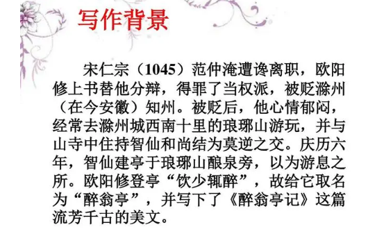 《醉翁亭记》体裁: 《醉翁亭记》是一篇“记”是散文的一种体裁。“记”的人,一种就是那些“傲逸狂醉”的人。所以,在初贬夷陵时,他就“益慎职,无饮酒”。 然而有趣的是,在十年之后,他却在滁州改变了自己的形象。这种神奇的转变无疑具有现实背景,也体现着欧阳修思想变化的痕迹,因为在这以后,醉酒的情趣在欧阳修的诗文中竟成了经常性的主题。 |