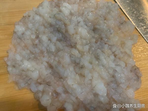 第三步:将新鲜大虾的虾头去掉,从尾部挑出虾线,取出里面的虾肉,虾肉清洗干净,剁碎成细末,放在容器之中。 第四步:虾肉放在器皿里,加上少许料酒和葱姜水(主要是去腥),加上一大勺生粉,滴入一些辅食油,调入食盐和胡椒粉,用手迅速抓均匀,让其上劲。