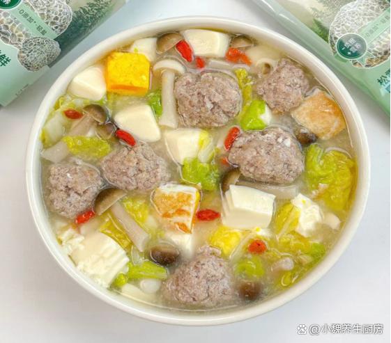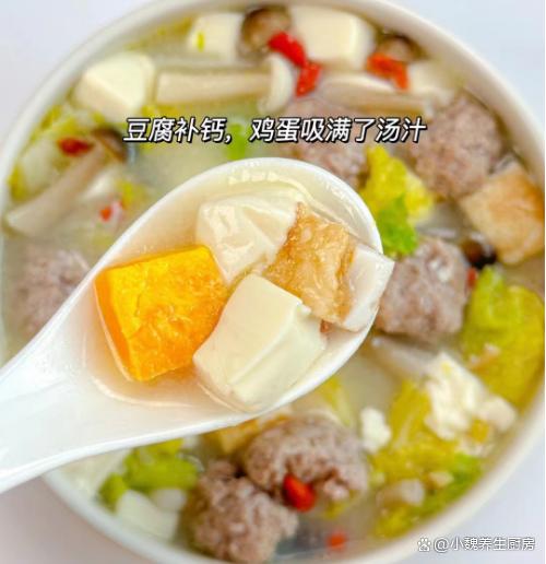 6:放入一些豆腐块,加上一大碗开水,让汤汁煮至奶白色,将猪肉末搓成小丸子,一次性下入到锅中,小火炖煮一会儿。 7:放入一些娃娃菜和枸杞子,加上少许食盐和鸡精,调入一小勺胡椒粉,撒上若干小葱花,焖煮1-2分钟即可,这款娃娃菜菌菇煎蛋豆腐汤就可以食用了。 娃娃菜菌菇煎蛋豆腐汤是一款好喝不油腻的家常汤品,食材非常多样性,汤汁特别鲜美,菌菇能够让汤品更鲜美,肉丸子个个都Q弹,豆腐鲜嫩可口,入口即化,汤品喝起来暖和和的,给人温暖的感觉。