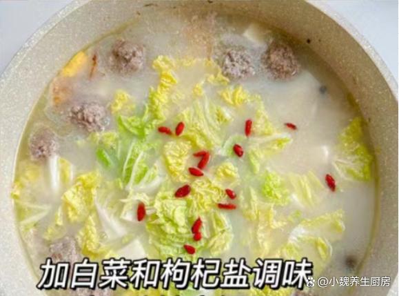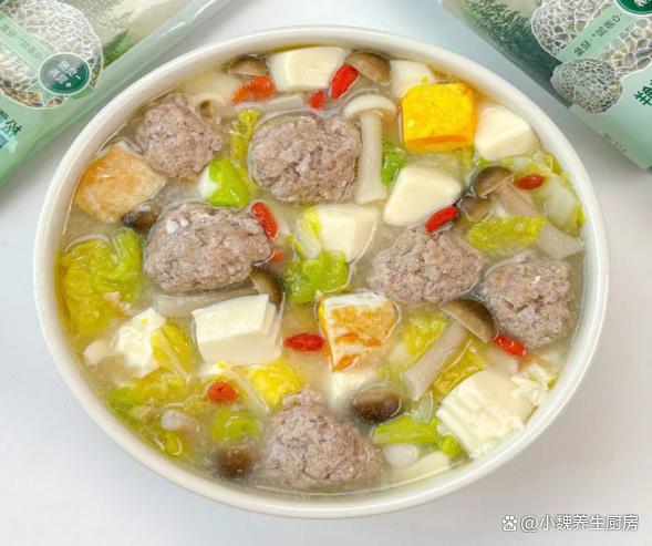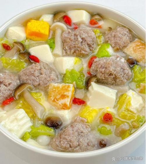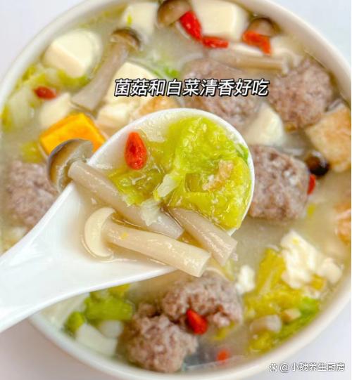 进入新年第一个月,一月到月末才会开春,从月初到月末要经历非常困难的日子,处于非常寒冷的阶段,很多人称为“数九寒天”,阴冷潮湿的天气让人不舒服,感觉浑身没有力气,导致我们的抵抗力低下,中老年人会很容易生病。到了冬天,严寒的天气带走身体的营养,我们需要多补充营养,多吃一些应季的蔬菜,多喝各种暖和和的汤品,比如说这款娃娃菜菌菇煎蛋豆腐汤,汤汁特别鲜美,喝起来很舒服。“一月多喝汤,郎中不用帮”,建议多喝这汤,营养全面,增强免疫。  【娃娃菜菌菇煎蛋豆腐汤的食谱解析】 食材明细:选购新鲜娃娃菜100克左右(娃娃菜是一种清甜的蔬菜,口感偏清甜一些,富含丰富的维生素C,食用方法有很多,帮助减脂刮油,非常适合来煮汤),蟹味菇120克,海鲜菇80克左右,选购新鲜梅花肉200克左右,香葱若干根,豆腐一小块(建议选择嫩豆腐,口感会更好,营养价值也很出色,怎么吃都好吃),冷水和开水少许,生姜半块,香葱若干根,鸡蛋一枚,枸杞子10克,原味酱油一勺,料酒半勺,少许食盐和胡椒粉,半勺鸡精,食用油少许,其他佐料。 详细制作步骤: 1:提前选购好娃娃菜,菌菇,鸡蛋,猪肉和嫩豆腐,把两种菌菇的根部切掉,用盐水浸泡一会儿,洗净控干表面的水分。 2:将香葱洗净切成葱花,几片生姜切成细末,猪肉去皮洗净,剁碎成猪肉末,猪肉末放在碗中,加上半勺料酒,加上原味酱油一勺,放入葱花和姜末,加上少许淀粉,将猪肉末用筷子搅拌均匀,放置一小会儿。3:嫩豆腐用冷水浸泡,捞出切成小方块,娃娃菜的叶子掰下来,切掉老一点的茎,洗净切成若干小块,控干水分即可。 4:枸杞子用清水洗干净,锅中烧热后,加上适量植物油,打入鸡蛋煎至定型,盛出放凉,切成若干小块,备用。 5:锅中加上食用油或猪油,放入一些葱白和姜末,倒入菌菇炒至变软,放入煎好的鸡蛋块,迅速翻炒均匀。