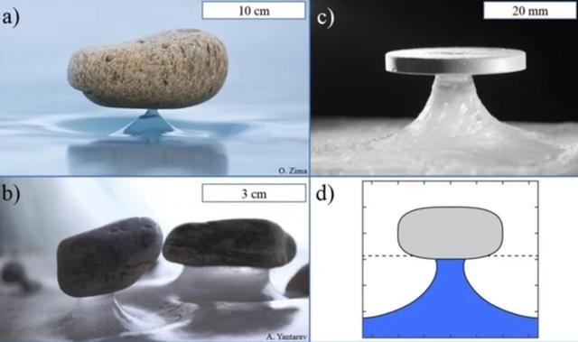 最近,物理学家在实验室中重复了这一现象,终于弄清了“禅石”的形成原理。物理学家发现,这块石头就像一把伞,挡住了太阳辐射,减慢了它下面冰层升华的速度,从而形成了一个狭窄的冰柱子来支撑石头。此外,石头本身的远红外黑体辐射造成了柱子底部周围的浅凹陷。