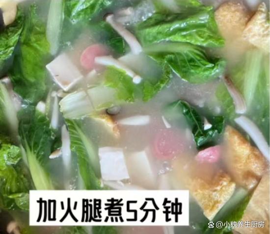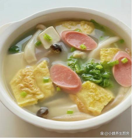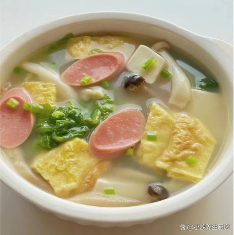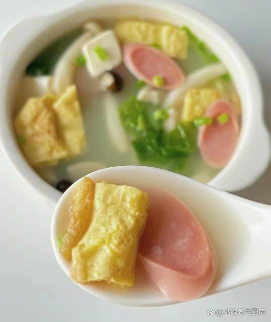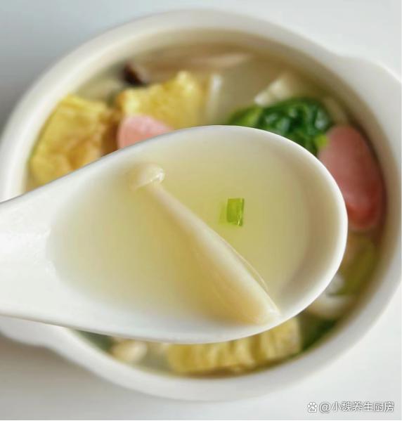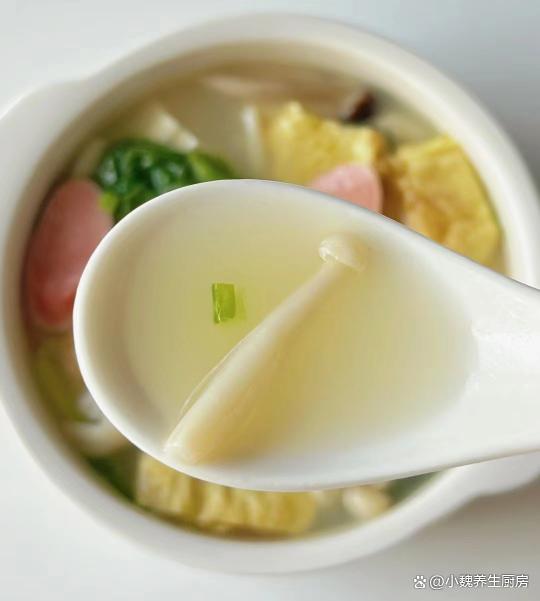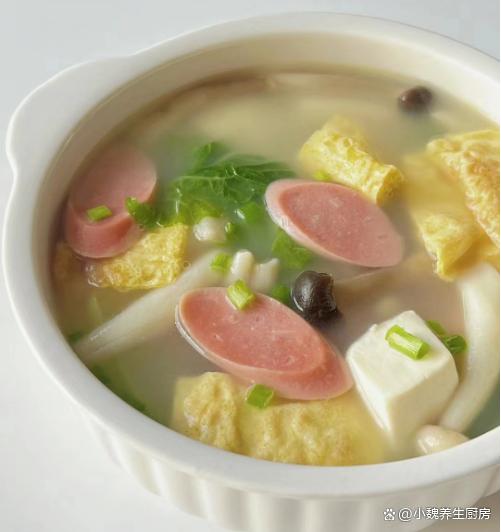 6:最后下入火腿肠片,小火焖煮一会儿,加上半勺味极鲜提鲜,加上一丢丢胡椒粉和食盐,最后撒上小葱花点缀。 7:关火出锅,这道菌菇火腿肠豆腐汤就烹饪完成了。 菌菇火腿肠豆腐汤是一款超级鲜美的汤品,几种菌菇和豆腐是绝配,汤汁鲜美十足,喝起来更加暖和,补钙质,为身体提供大量的营养,大人和孩子都爱喝。 网友们,你们是否喝过这款菌菇火腿肠豆腐汤呢?(文中的配图都来自网络)