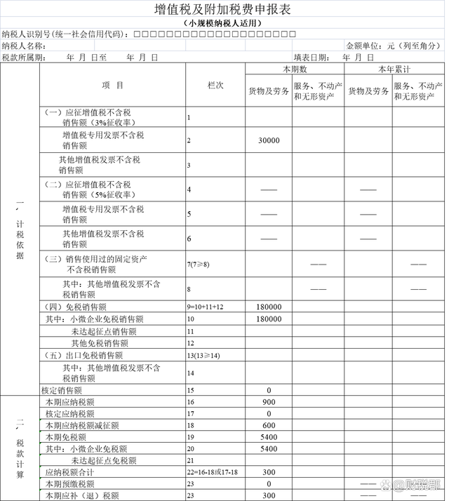 举例:来源: www.ws46.com 2023年甲公司(小规模纳税人)销售办公品,第一季度销售收入(选择按季度申报)如下:未开票销售额(含税)80800元;开具1%普票销售额(含税)101000元;开具1%专票销售额为30300元,无其他收入。 甲公司季度应税销售额合计为80800÷(1 1%) 101000÷(1 1%) 30300÷(1 1%)=210000元。 季度应税销售额未超过免征额,未开票以及开具普票的应税销售额可以享受免税政策;开具专票的销售额,需要按照开票税率缴纳增值税,应纳税额=30300÷(1 1%)×1%=300元,享受的应纳税额减征额为=30300÷(1 1%)×2%=600元。 纳税申报表主表填报如下图: