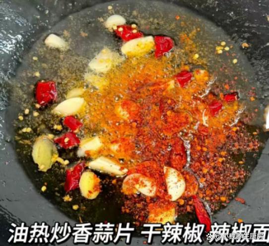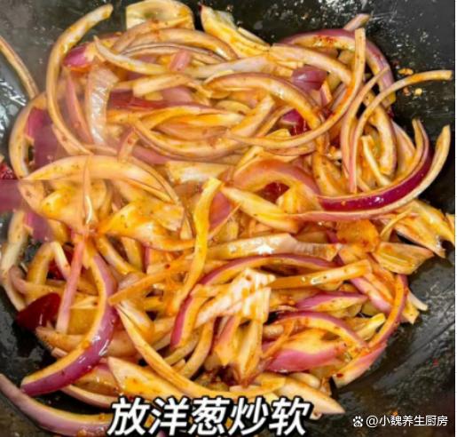 步骤6:锅中留少许油,加上干辣椒,蒜片,一勺辣椒面,迅速翻炒均匀,倒入洋葱丝炒至变软。