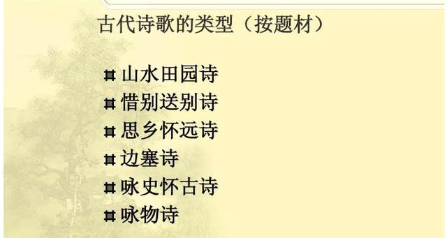 从诗歌的形式上分可分为三类:古体诗、近体诗和现代诗。 如果按内容分可分为:叙事诗、抒情诗、边塞诗、咏物诗、送别诗、山水田园诗、闺怨诗、怀古诗、悼亡诗、行旅诗等。