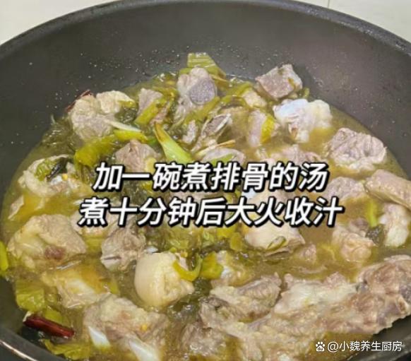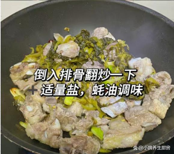 7:倒入排骨迅速翻炒,加上少许食盐和白糖调味,加上少许生抽,老抽和蚝油少许,加上一小碗焖排骨的汤汁,大火收汁,关火出锅,这道酸菜焖排骨就可以开吃了,风味独特,吃起来特别解馋。
