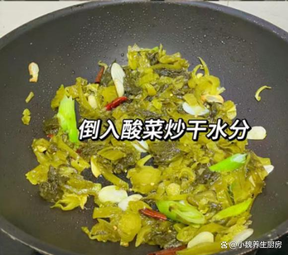 6:锅中调入少许食用油,放入葱段,蒜片,干辣椒和姜片,迅速煸炒一小会儿,倒入酸菜炒出水分来。 来源: www.ws46.com