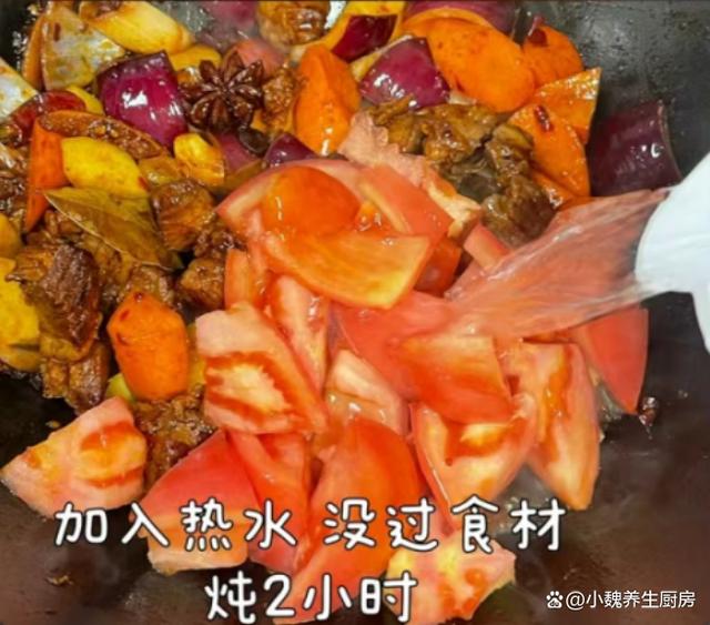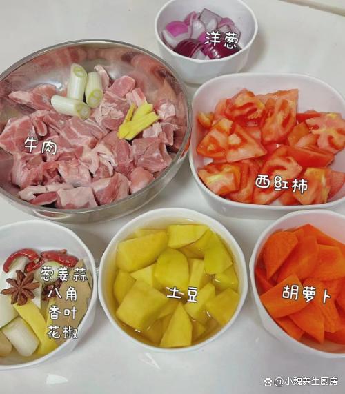 时光荏苒,已经过完了2023年,2024年充满了期待,一月一开始就是王炸,因为处于三九天和四九天,目前是三九天,也是今年冬天最冷的时候,寒冷的天气让南方人窒息,根本都不想出门上班,每次周末都在家吃饭。随着生活越来越富裕,我们每天都可以吃大鱼大肉,今天分享一道我们家晚餐的菜肴——西红柿土豆炖牛腩,逢年过节给家里人吃,招待客人也很有面子。很多人不会烹饪这道菜肴,现在跟着小编学起来吧。三九天,无论贫富,多给家人吃这菜,营养又解馋,大人孩子都爱吃。  【西红柿土豆炖牛腩的食谱解析】 食材明细:选购几个土豆(土豆又叫马铃薯,属于多功能的蔬菜,可以炒、炖、煮、蒸等多种方式烹制,价格也不贵,可以搭配牛肉或羊肉是绝配),半根大葱,生姜一大块,几片香叶,少吃冷水和温水,生抽几勺,蚝油一勺,老抽一勺,几个八角,食用油若干,一勺白糖或冰糖,一勺郫县豆瓣酱,新鲜牛腩350克左右,紫洋葱半个,胡萝卜2根,西红柿一个,少许食盐,胡椒粉和鸡精少许,其他佐料。 详细制作顺序: 第一步:提前选购好西红柿,土豆,牛腩和其他配菜,先把几个土豆洗净去皮,洗净切成若干小块,放在碗中备用。第二步:撕掉紫洋葱的外皮,用盐水浸泡一会儿,洋葱切成若干小块,生姜切成一些片状,大葱洗净切成小段,备用。第三步:将香叶和八角洗干净,几根胡萝卜洗净去皮,切成若干滚刀块,西红柿的外皮洗净,去掉多余的蒂,切成若干小块,备用。 第四步:将牛腩彻底洗干净,切成若干小块,锅中放入牛腩,加上适量冷水没过食材,放入葱段,姜片和料酒,水开后撇去一层浮沫,捞出用温水冲洗几遍。 第五步:锅底加上适量食用油,让油温提前烧热,放入一些葱段,姜片,八角和香叶,将香味都炒出来。