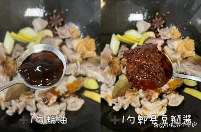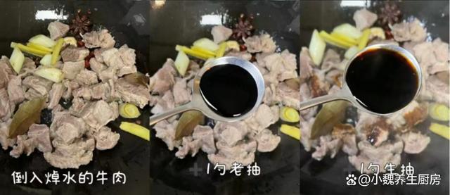 第六步:倒入焯水好的牛肉,加上一勺生抽和几勺生抽,加上一勺蚝油,加上一勺红油豆瓣酱,加上一小勺白糖或冰糖,用锅铲翻炒均匀。