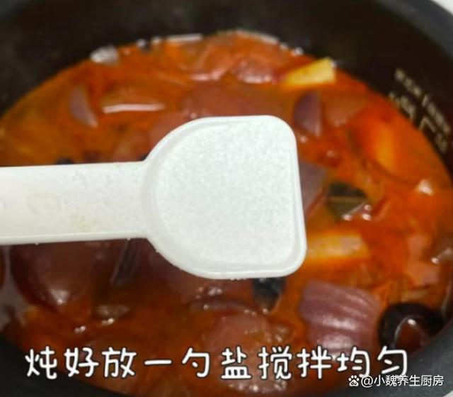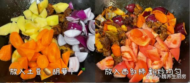 摘自: www.ws46.com 第七步:放入一些紫洋葱,胡萝卜和土豆块,放入一些西红柿块,用锅铲翻炒均匀,加上适量温开水,没过食材,中小火炖2个小时。 第八步:加上少许食盐和鸡精,大火收汁,这道西红柿土豆炖牛腩就制作完成了,吃起来特别有胃口。 西红柿土豆炖牛腩是非常下饭的菜肴,主要选用牛腩,胡萝卜,西红柿和土豆制作而成,经过小火慢炖,牛腩软烂入味,汤汁特别浓郁,吃起来特别有食欲,越吃越想吃,不懂吃可惜了。