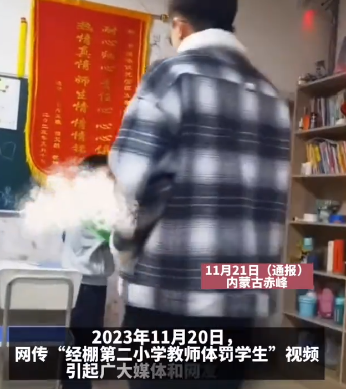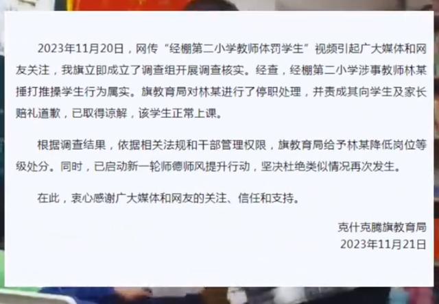 21日,内蒙古克什克腾旗教育局就“经棚第二小学教师体罚学生”一事发布通报。经查,经棚第二小学涉事教师林某捶打推搡学生行为属实。旗教育局对林某进行了停职处理,并责成其向学生及家长赔礼道歉,已取得谅解,该学生正常上课。在11月20日,一段网传视频引发了广泛关注。视频中,内蒙古赤峰经棚第二小学的一名教师捶打推搡学生,让人痛心。视频中的一幕让人愤怒:一个哭泣的男孩站在桌椅旁,用手擦拭眼泪。一名男子走上前,将男孩推搡至座椅上,不断捶打其胸口,并拉扯其衣服。男孩痛苦地哭喊道:“我不哭了。”拍摄者出言阻止:“他不听话你也不能这么揍吧”、“他才9岁”。然而,该男子却辩称自己对男孩“费心了”,并拿起手机准备给男孩父亲打电话。