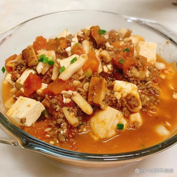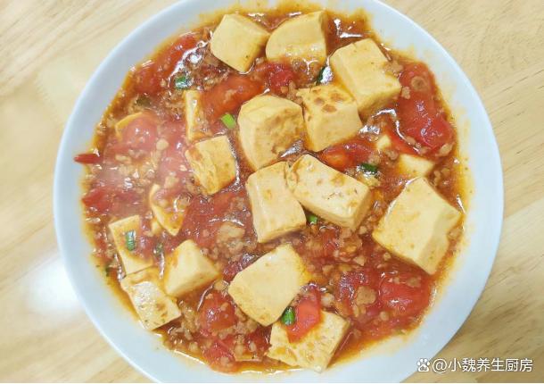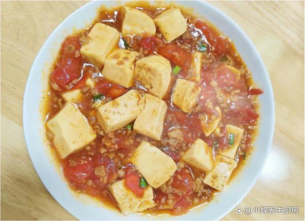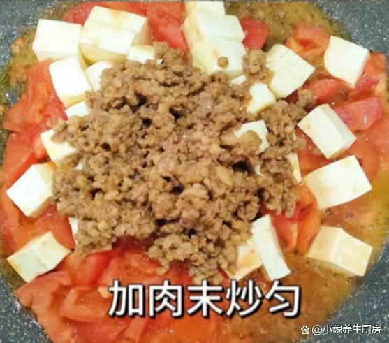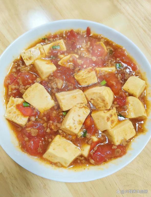 转眼到了新年,去年过得非常糟心,一年都不是很顺,迎来新年的第一个月份,我们需要更加充满活力,对未来更有希望。现在还处于寒冬阶段,一整天的气温起伏大,最低气温接近零摄氏度。南方的小伙伴,生活在没有地暖的居室里,在家里都感觉很冷,冷得全身直哆嗦,身体的很多营养被消化光了。冬季到了,我们要多穿一些衣服,按时给身体补充能量,比如高蛋白和高铁的食材,比如牛肉或猪肉。今天准备用番茄,豆腐和猪肉制作一道拿手菜——番茄肉末豆腐,几分钟就做好了,总吃不腻。1月,无论多忙,豆腐和它煮一锅,营养又美味,全家人都爱吃!  【番茄肉末豆腐的食谱解析】 准备一些食材:嫩豆腐一小块(豆腐是一种平价的食材,主要选用大豆制作而成,豆腐兼容性极佳,可以搭配许多食材一起吃,口感超级嫩滑,营养非常丰富,钙质含量高,非常适合凉拌或煮汤),120克番茄(番茄是一种新鲜的果蔬,其中维生素C和番茄红素含量最高,汁水特别丰富,吃起来酸甜开胃,食用方法有很多,番茄汤是我们家的最爱),冷水少许,姜蒜少许,半块新鲜前腿肉(或者选择梅花肉,价格便宜,肉质很鲜嫩,都是制作肉末的首选),少许食用油,生抽和蚝油若干,半勺白糖,少许红薯淀粉,一勺食盐,其他佐料。 正确做法: 1:提前准备好新鲜煮沸,嫩豆腐,番茄和其他食材,将番茄的外皮洗净,也可以用热水烫一下外皮,去皮切成若干小丁,不能切太大了,快速炒出里面的汁水来。2:一小块豆腐放在容器里,加上适量清水漂洗,流水冲洗干净,切成大小相同的方块,香葱和姜蒜切成细末,放在碗中备用。3:将前腿肉的猪皮和肥肉去掉,瘦肉反复冲洗干净,切成若干小块,用刀剁碎成猪肉末,全部放在器皿里。 4:猪肉末提前用料酒去腥,加上少许红薯淀粉,加上一丢丢食盐腌制,加上半勺生抽和半勺蚝油,放入一些姜丝,用手快速抓拌均匀,腌制一小会儿。 5:锅中慢慢烧热,加上食用油若干,倒入腌制入味的肉末,用锅铲迅速煸炒,加上半勺生抽,加上一小勺食盐,翻炒一分钟,装在碗里,备用。
