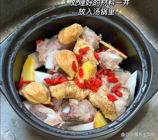 时间转眼即逝,一年又一年,2023年已经过去,2024年越来越好,我们对未来的憧憬,迎来了崭新的一月份,一月也处于寒冬时节,过了小寒节气以后,预示着正式迈入寒冷的新阶段,这个时候的寒冷可以用“阴冷”来形容,让人两腿直抖擞,手掌都被冻伤了。在这种非常极端的天气里,我们需要注意添衣御寒,调整我们的饮食,少吃寒性的食材,多吃一些温热的食物,尤其是要多喝汤,更加利于营养的吸收,用来抵御寒冬的入侵。今天为网友们推荐一款鲜汤——白萝卜无花果陈皮排骨汤,几种简单的食材,每周喝几次,汤汁鲜美极了,冬季喝它正合适。“一月多喝汤,不用郎中帮”,平常多喝这汤,补足营养,安稳过冬。  【白萝卜无花果陈皮排骨汤的食谱解析】 食材明细:选购白萝卜320克(白萝卜是冬季的热门蔬菜之一,民间有“冬吃萝卜,夏吃姜”的说法,几毛钱一斤,口感非常清甜,可以荤素搭配一起吃,萝卜汤喝起来很美味,帮助增强免疫力,让你冬天少生病),陈皮两片,无花果若干个,温水少许,纯净水少许,优质排骨350克左右,生姜15克左右,少许食盐,胡椒粉半勺,花雕酒少许,香葱和香菜几根,枸杞子一小把,其他。 具体制作步骤: 步骤1:提前准备好白萝卜,无花果,陈皮和排骨等食材,先把陈皮用温水泡发,刮掉白色的物质,洗净切成小块,备用。 步骤2:把无花果提前洗净和泡发,枸杞子用清水冲洗掉灰尘,清洗掉白萝卜的外皮,削皮切成小块,生姜切成若干片状,香葱洗净切成细葱花。 步骤3:提前让商贩将排骨剁块,排骨里面有一些血丝,需要用冷水冲洗干净,用冷水漂洗几遍,冲洗掉血水,控干排骨的水分。步骤4:提前准备好煲汤的砂锅,也可以用电压力锅,锅中放入焯烫好的排骨,放入陈皮几片,加上姜片少许,放入白萝卜块和无花果,记得多加一些清水,没过全部的食材,不建议中途加水。 步骤5:调到大火炖煮开,舀掉一层浮沫,转小火煲40分钟,出锅之前放入洗净的枸杞子,加上食盐半勺,加上一小勺白胡椒粉,继续焖煮一会儿。 步骤6:关火出锅,这道白萝卜无花果陈皮排骨汤就烹饪完成了。 白萝卜无花果陈皮排骨汤一款清热去火的汤品,非常适合秋冬两季食用,寒冬后的天气阴冷,阳气减弱,阴气渐收,湿气很重,全身无力,抵抗力很差。天冷以后,我们身体很虚弱无力,很多疾病找上门,可以尝尝这款白萝卜无花果陈皮排骨汤,润肺止咳,促进各种营养的消化,增强抵抗力。网友们,你们是否掌握这道白萝卜无花果陈皮排骨汤的正确做法?(文中的配图均出自网络)