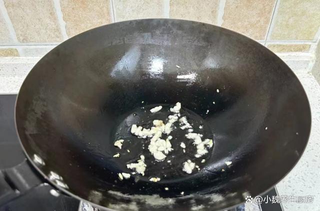 第六步:大蒜和生姜切成细末,锅底留少许油,放入一些蒜末爆香,倒入口蘑和荷兰豆,将其炒至断生。