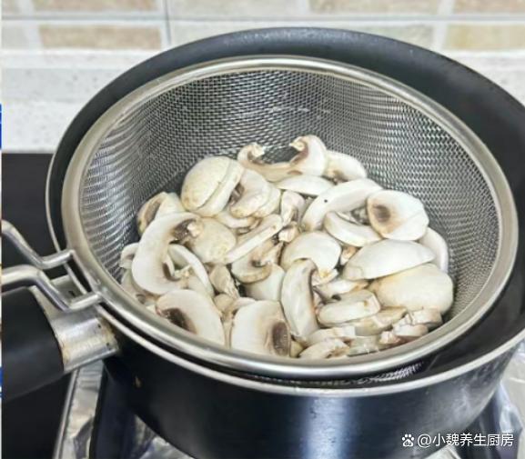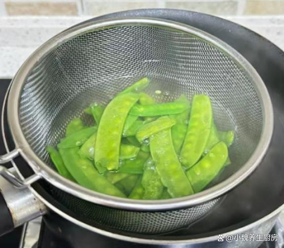 第二步:将荷兰豆的老茎撕掉,去掉两头洗干净,锅中煮一小锅清水,煮沸后加入食盐一勺,先倒入口蘑焯水处理,捞出备用,然后倒入荷兰豆焯水处理,这样蔬菜的口感更好,色泽更好看。