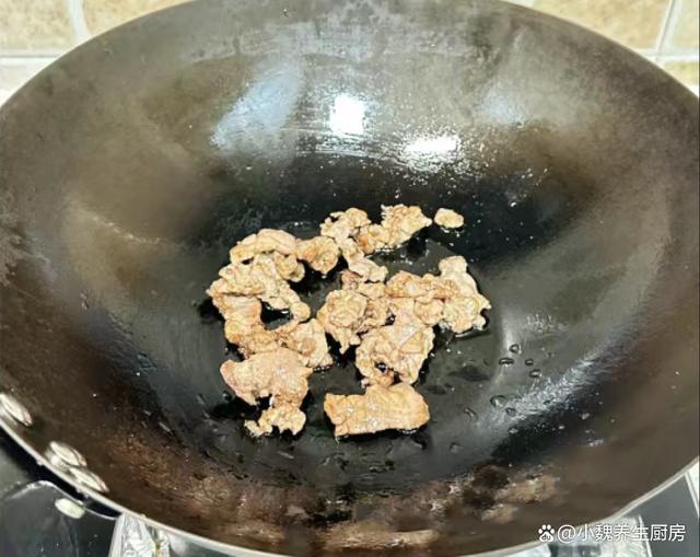 第五步:锅底提前烧热乎,加上食用油烧热,滑入腌制好的牛肉片,用锅铲快速煸炒,炒至8成熟,盛出备用。
