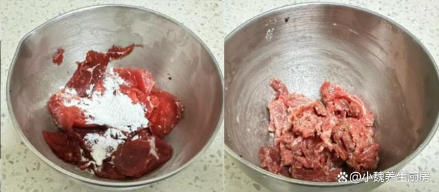 第三步:将牛肉里脊彻底洗干净,去掉多余的部位,逆着纹路切成若干薄片,牛肉片用刀背拍一下,这样牛肉的口感更嫩。 第四步:牛肉片放在容器里,加上半勺料酒去腥,加上适量生粉或淀粉,加上一小勺食盐,加上原味酱油少许,滴入一些辅食油,锁住牛肉的营养,静置15分钟即可。