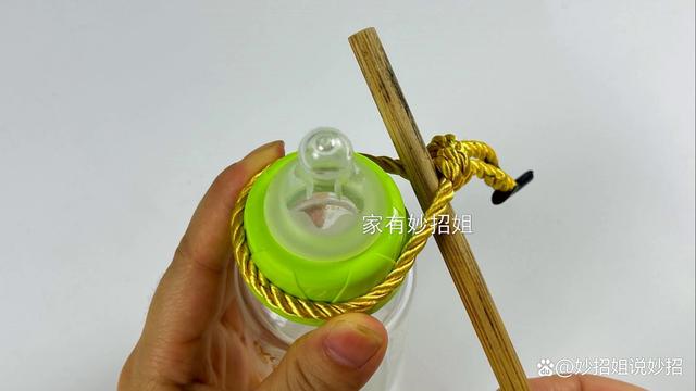 将绳子套在瓶盖上后,我们再准备一根木棍,把木棍从绳子旁边空隙的地方穿进去。