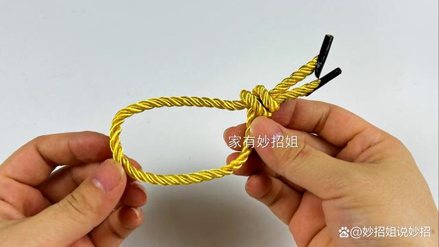 我们先准备一根牢固一点的绳子,比如礼品袋上的手提绳,这个绳子非常的牢固,不用担心会出现断裂的情况。先将绳子的两头给它打个结固定住,这样就变成了一个圆圈的样子。