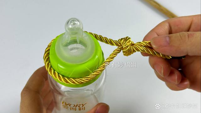 接下来,我们再把这个绳子套在瓶盖上面。要是瓶盖比较小,绳子比较长的话,可以把绳子重叠几圈,直到比瓶盖稍微大一点就可以了。