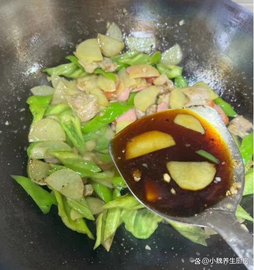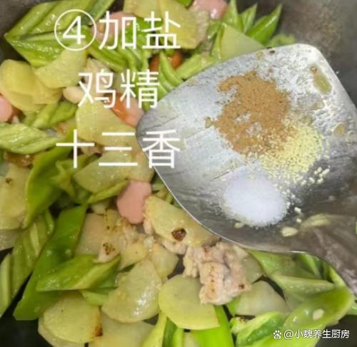 第六步:加上少许白糖和食盐调味,加上一小勺鸡精和十三香,最后加上生抽和蚝油,等待食材炒至变软。