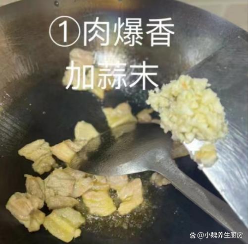 第四步:锅底提前烧热,加上适量食用油,油温烧热至7成热,倒入五花肉煸炒出肥油,加上姜蒜末炒香。