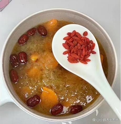 6:最后丢入一些枸杞子即可,焖煮一小会儿,这道红薯红枣银耳枸杞汤就制作完成了,贫血的小伙伴要多喝它,让你气色越来越好,肌肤更显年轻。www.ws46.com