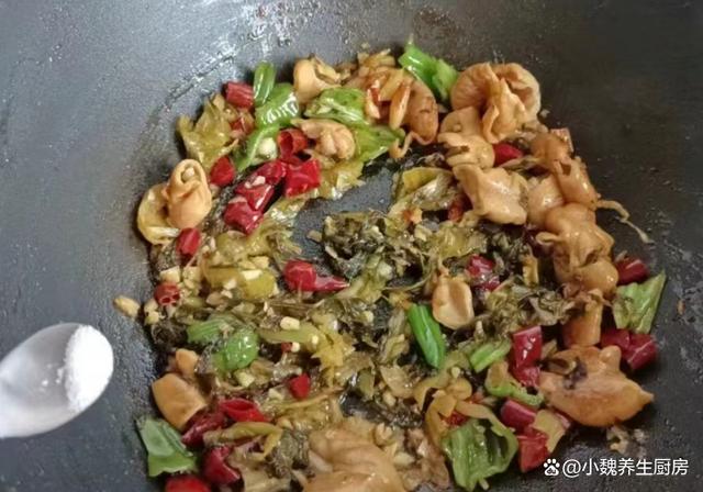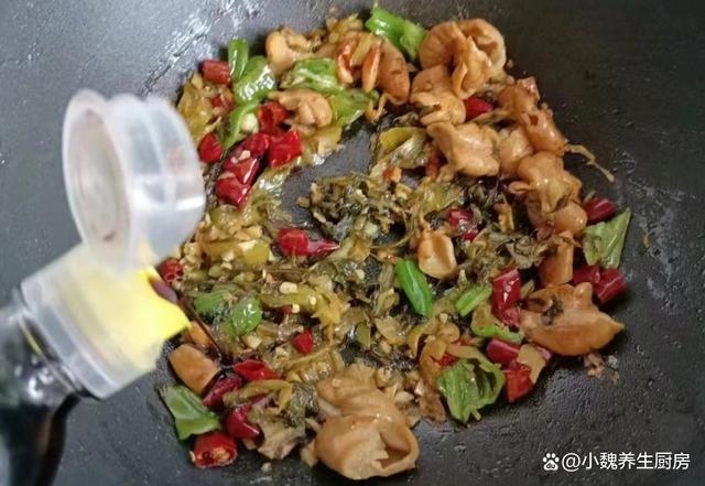 第八步:加上少许生抽和半勺老抽,加上一小勺蚝油,加上鸡精和食盐少许,将菜肴翻炒均匀即可,关火盛出,这道酸菜炒肥肠就开吃了。 酸菜炒肥肠是一道超级下饭的菜肴,主要选用肥肠,酸菜和青椒制作而成,吃起来酸辣开胃,酸菜吃起来特别脆爽,让人超级有食欲,就是特别费米饭,不懂吃可惜了。 网友们,你们是否掌握这道酸菜炒肥肠的正确做法呢?(文中配图都出自网络)
