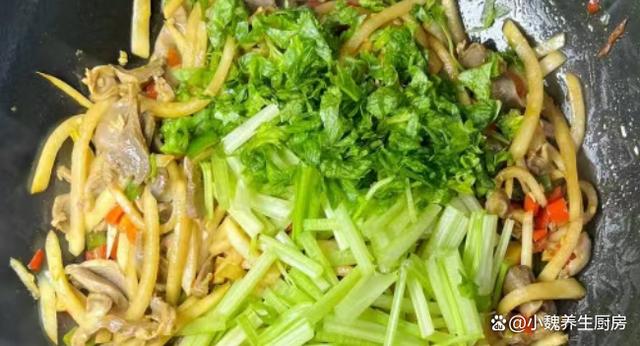步骤8:放入一些芹菜段或蒜苗,用锅铲快速爆炒,关火装盘,这道萝卜丝炒鸡胗就可以开吃了。 萝卜丝炒鸡胗是一道特别下饭的菜肴,冬季可以尝一尝这菜,萝卜丝非常脆爽,鸡胗的口感非常脆嫩,搭配一些辣椒炒一盘,色泽特别好看,香辣开胃,越吃越过瘾。