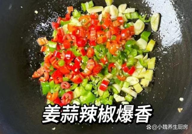 步骤6:锅底继续加上食用油,放入一些泡椒,蒜末和姜末,加上小米辣和青椒圈,迅速爆炒出香味来。
