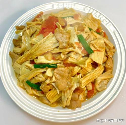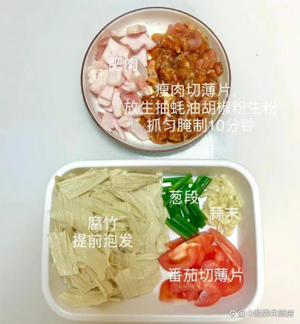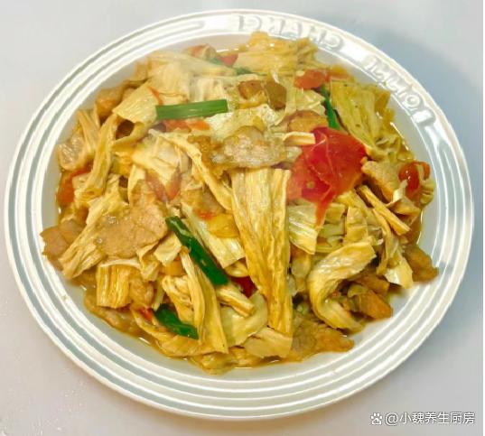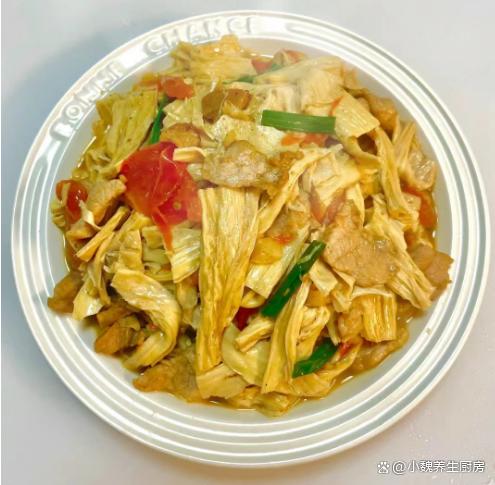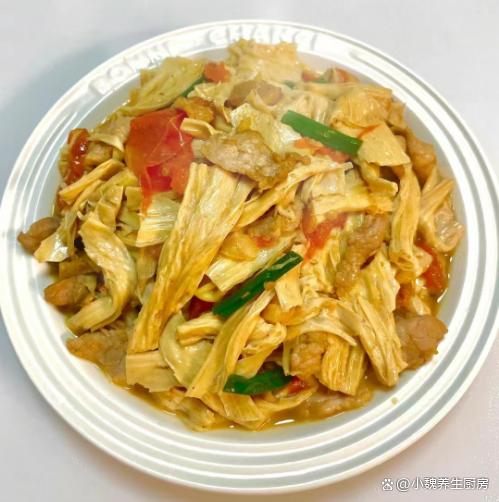 一晃眼就到了2024年,感觉一年就过完了,冬季已经悄悄度过一半了,很多人还沉浸在秋季里,就迎来阴冷的冬天,元旦前后,是冬季最暖和的日子,出门转了转,去商场给家里人选购新衣服,害怕过几天又降温了。听说再过几天,就要迎来小寒节气,会觉得气温越来越冷,会迎来2024年的第一场雪,这个时候要多吃肉类,给身体储备能量,才能抵御寒冬。今天分享一道适合冬季吃的菜肴——茄汁腐竹炒肉片,简单省事,好吃还不贵,学起来吧。冬季,这菜记得要使劲吃,简单易学,营养又美味,总吃不会腻。  【茄汁腐竹炒肉片的食谱解析】 食材明细:购买干腐竹150克(腐竹又叫腐皮,是一种大豆研磨后,凝结而成的豆制品,是食材的精华之处,色泽好看,柔软细腻,吃起来风味独特,可以搭配各种食材炒着吃),若干根小葱,一些大蒜头,植物油少许,新鲜猪肉400克(建议要带一些肥肉,瘦肉需要提前腌制处理,这样肉片吃起来口感更好),番茄一个,少许水淀粉,食盐少许,生抽和蚝油若干,一小勺白糖,鸡精和胡椒粉少许,其他调味品。 具体制作顺序: 1:提前选购好腐竹,新鲜猪肉和番茄等食材,先把新鲜猪肉处理干净,洗净切成若干片状,瘦肉和肥肉要分开切。2:将瘦肉片放在碗里,加上一些葱姜水或料酒去腥,加上生抽和蚝油少许,调入一小勺生粉,加上一丢丢食盐和胡椒粉,让肉片被完全包裹,抓拌均匀,腌制一小会儿。 3:把番茄的顶部切一些口子,用开水把番茄皮烫一下,撕掉外面一层果皮,切成大小相同的小块,备用。4:将香葱洗净切成葱段,姜蒜切成细末,腐竹放在容器里,加上适量温水,加上一小勺食盐,将腐竹提前泡发开,捞出切成若干小块,控干表面的水分,准备好3种食材,开始烹饪这道茄汁腐竹炒肉片吧。 5:锅底提前预热,加上植物油若干,倒入一些肥肉快速煸炒,肥油煸炒出来,倒入瘦肉片快速煸炒,将其炒至变色,盛出即可。 6:锅中留少许油,放入葱白和蒜末,倒入番茄丁快速煸炒,让番茄汁炒出来,倒入腐竹迅速爆炒,加上白糖和食盐,翻炒均匀。