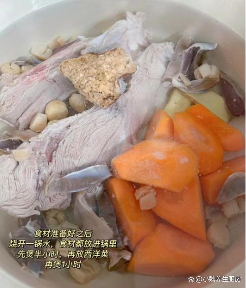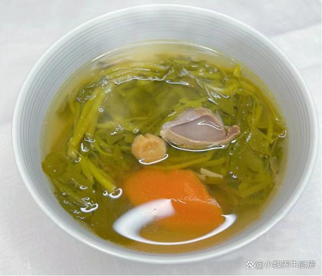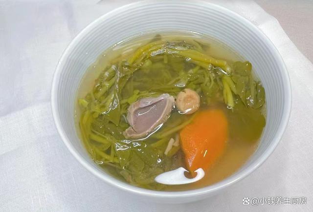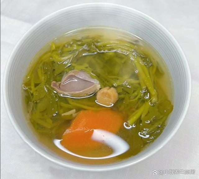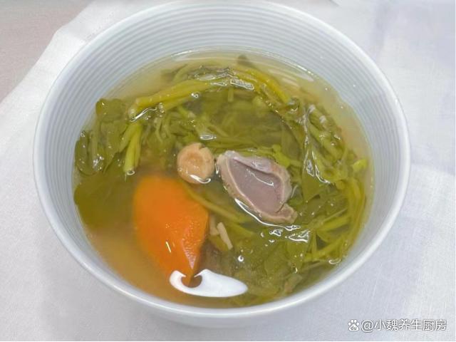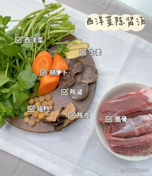 已经到了年末,马上要迎来2024年元旦佳节,新年的钟声即将敲响,新的一年,新的起点,如同朝阳一样,充满了希望和光明,在元旦佳节之计,一定要注意养生,多喝暖和和的鲜汤,才能给家里人安全感。元旦节日是法定节假日,是非常重要的日子,12月份一种在忙碌工作,没有时间照顾孩子和老公,过节会与家人和朋友聚在一起,这个时候不仅仅需要大鱼大肉,还需要各种暖和和的汤品,比如说这款西洋菜鸭肾陈皮猪骨汤,简单炖一锅,广东人每周都喝它。许多人肯定没有喝过这款鲜汤,不如跟着小编学起来吧。它是“冬季第一汤”,应季而食,营养易消化,顺利度过冬天。  【西洋菜鸭肾陈皮猪骨汤的食谱解析】 选购一些食材:选购腊鸭肾50克左右(腊鸭肾是鸭肾用食盐腌制处理后的美食,许多地方称为陈肾,既可以用来卤着吃,还可以用来炖汤)选购400克新鲜扇骨(扇骨是猪骨的部位之一,要选择色泽红润的,猪骨要处理干净,用来煲汤正合适),瑶柱40克(瑶柱是干制后的海鲜,泡发后非常有弹性,煲汤可以加入一些),陈皮12克左右,西洋菜一小把(西洋菜是广东地区特有的蔬菜,外地人没有见过,既可以用来炒着吃,用来煲汤也不错哦,更加利于营养的消化和代谢),冷水和温水少许,胡萝卜一根,食盐少许,半勺白胡椒粉,姜片少许,其他调味品。 正确制作顺序: